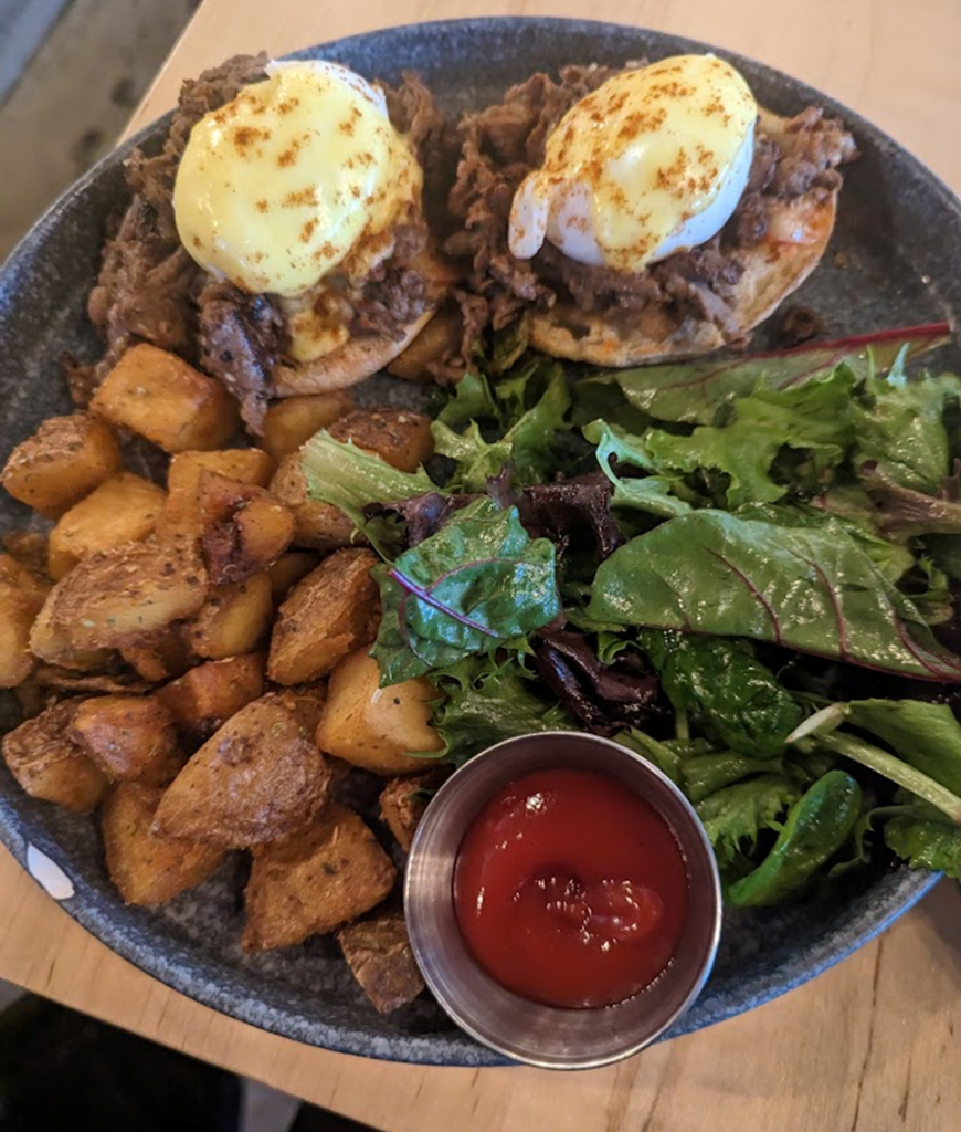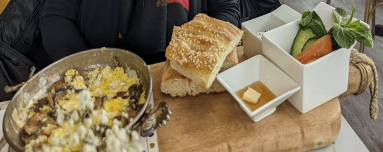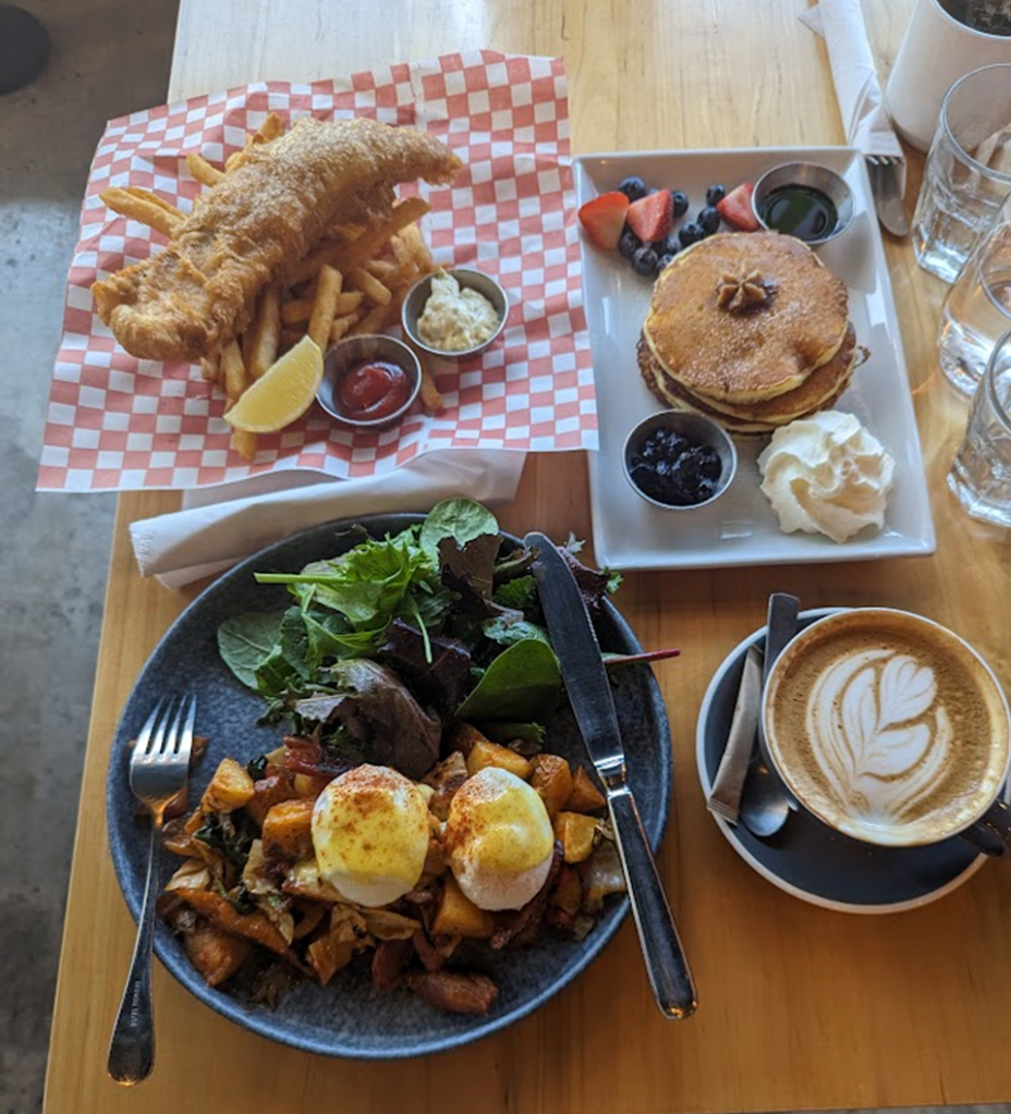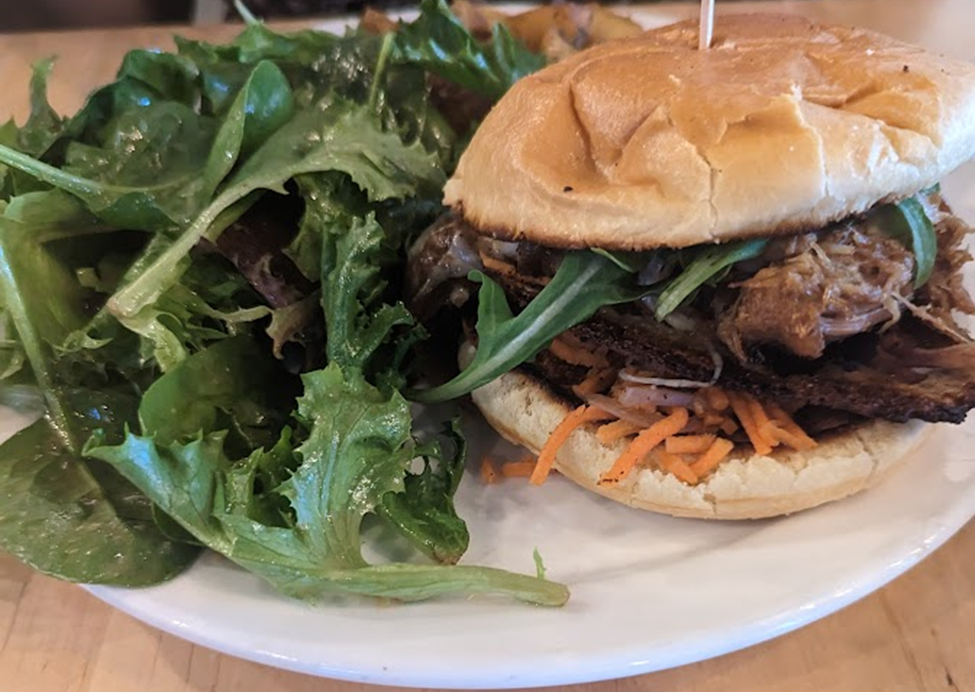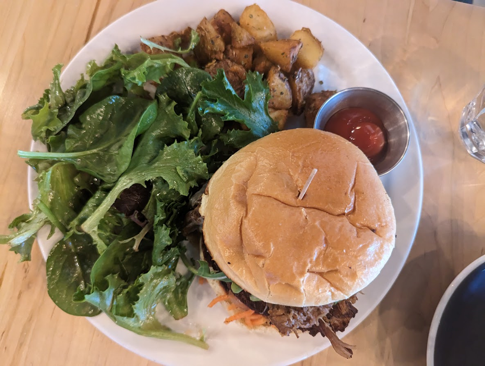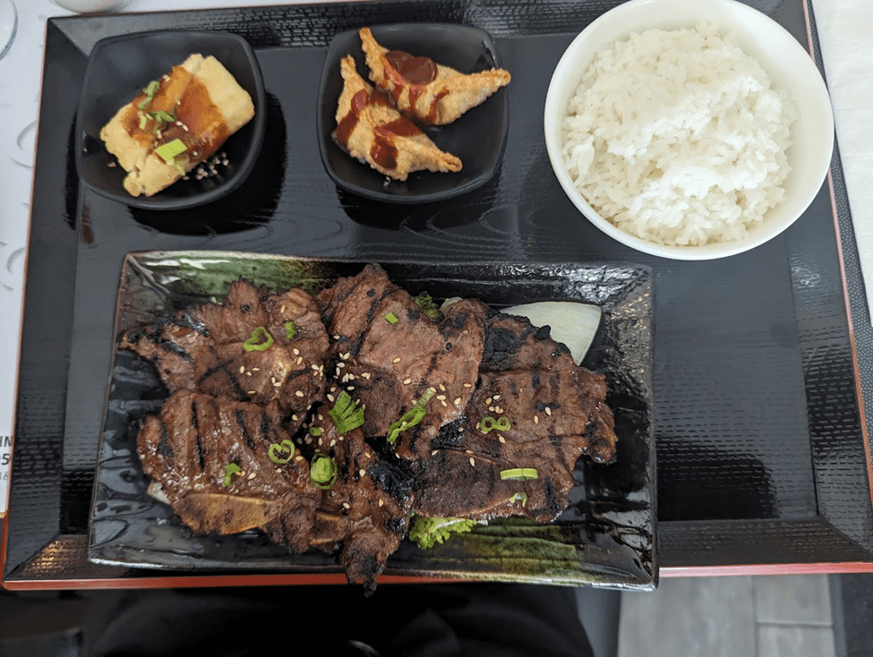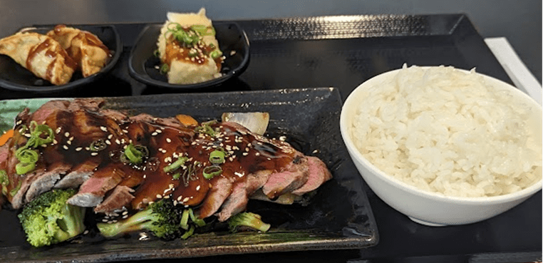 Figure 5: Veggie dumplings, Fried tofu, Beef teriyaki and rice.